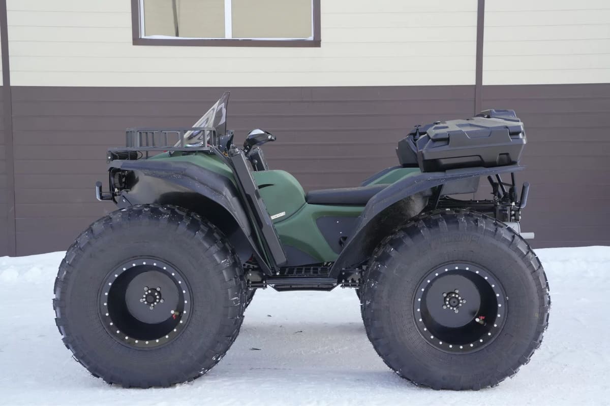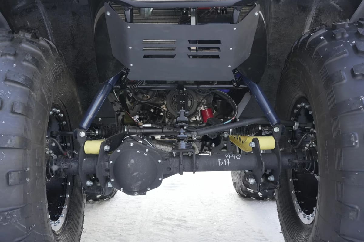 Квадроцикл оснащен мотором мощностью 110 л.с., что выдает достаточную производительность для эксплуатации техники в разных условиях. Средняя комфортная скорость передвижения составляет 60-70 км/ч, с максимальной ограниченной скоростью 85 км/ч. Благодаря таким показателя транспорт способен справляться со сложными маршрутами.
